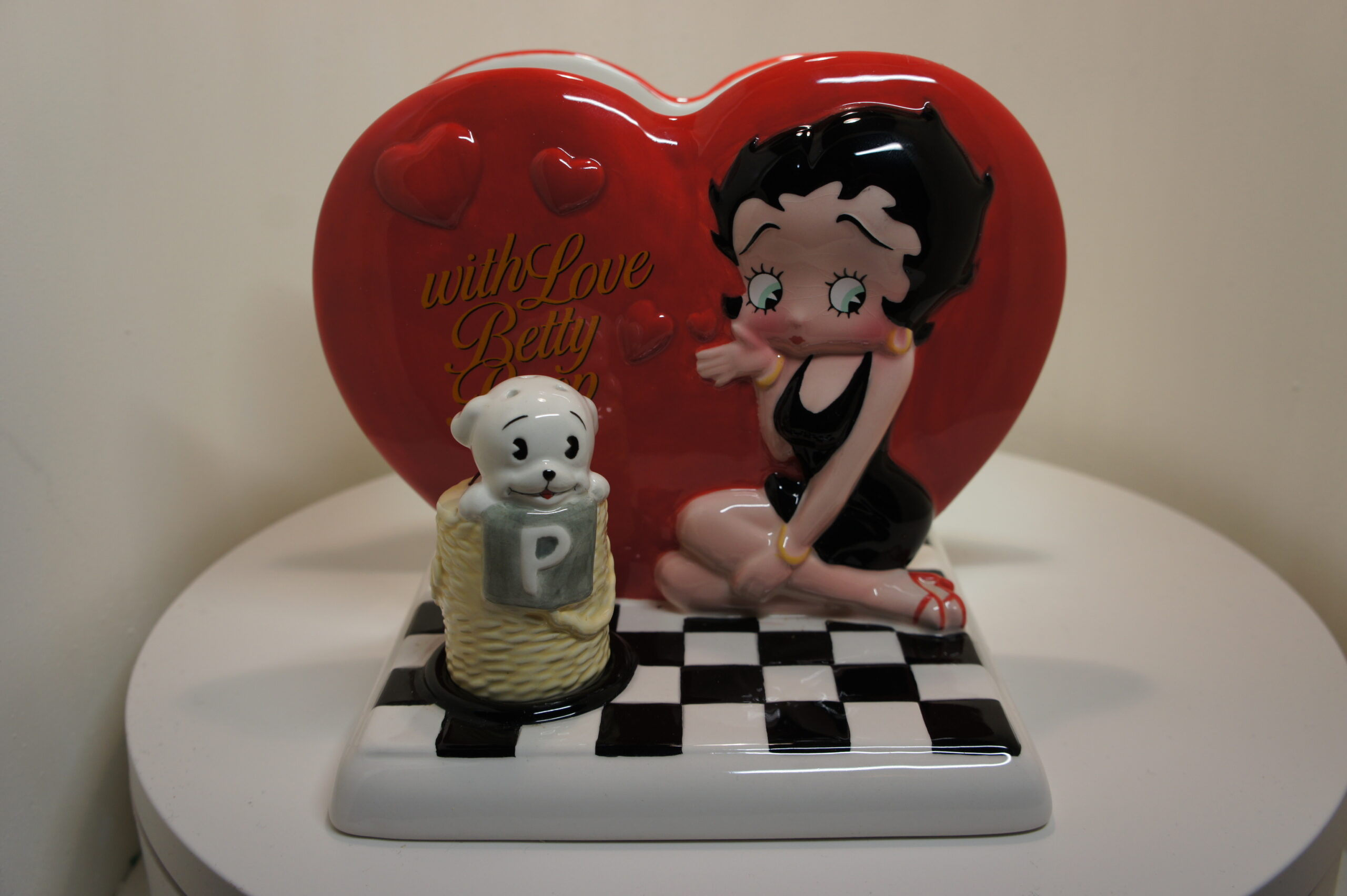 - Bijzonderheden: Compleet met originele servethouder, rood hart met tekst “With Love Betty Boop”, decoratieve hondjes op de strooiers