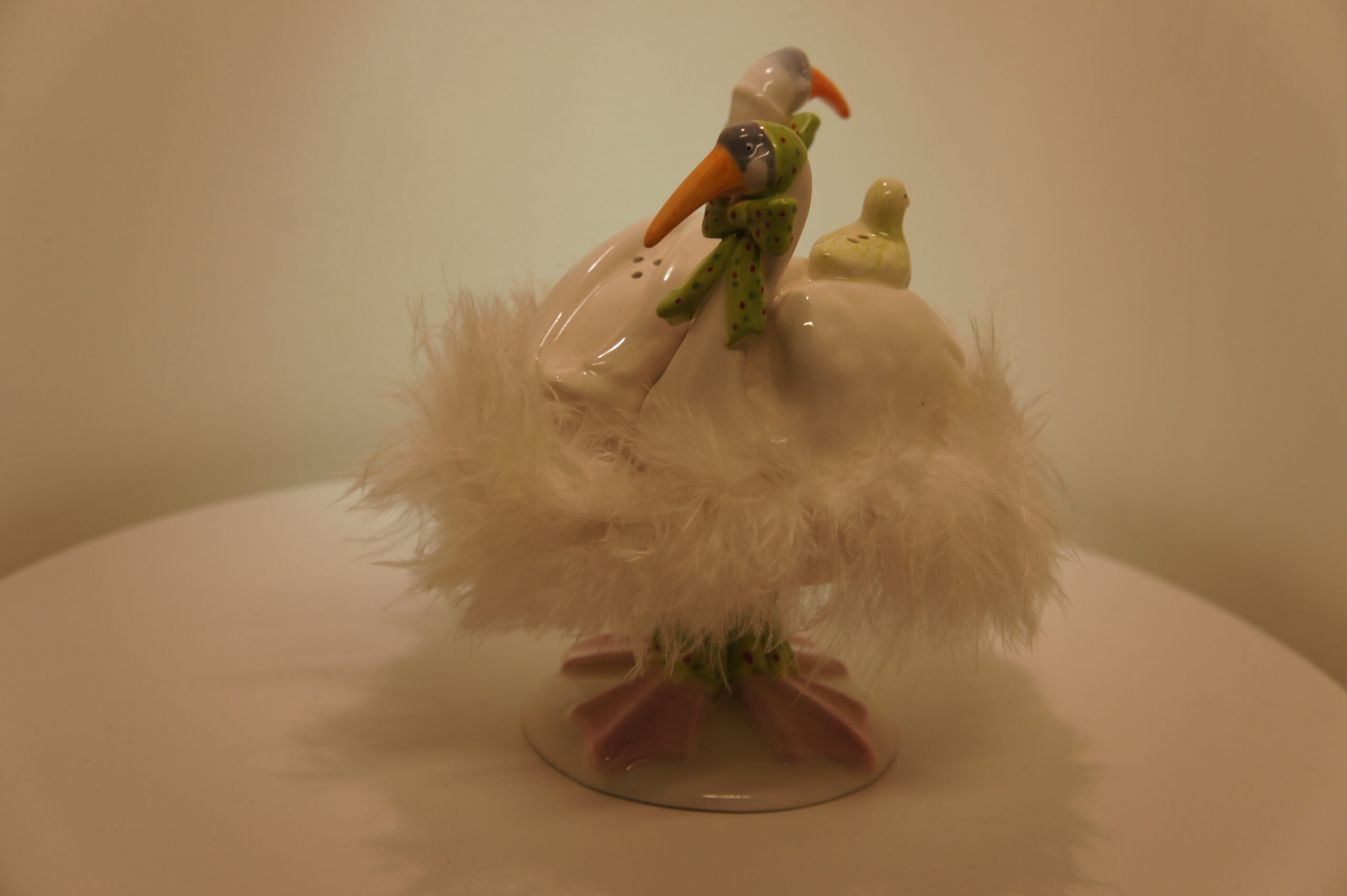 De vormgeving is decoratief en zorgvuldig opgebouwd. De zwanen vormen samen één object en zijn niet los van elkaar geplaatst. Daardoor oogt het stel als een klein tafereel. Bovendien zorgt de ronde voet onder het nest voor stabiliteit. De combinatie van keramiek en veren maakt dit peper en zoutstel keramiek zwanen anders dan een standaard tafelobject, zonder opvallend te worden.