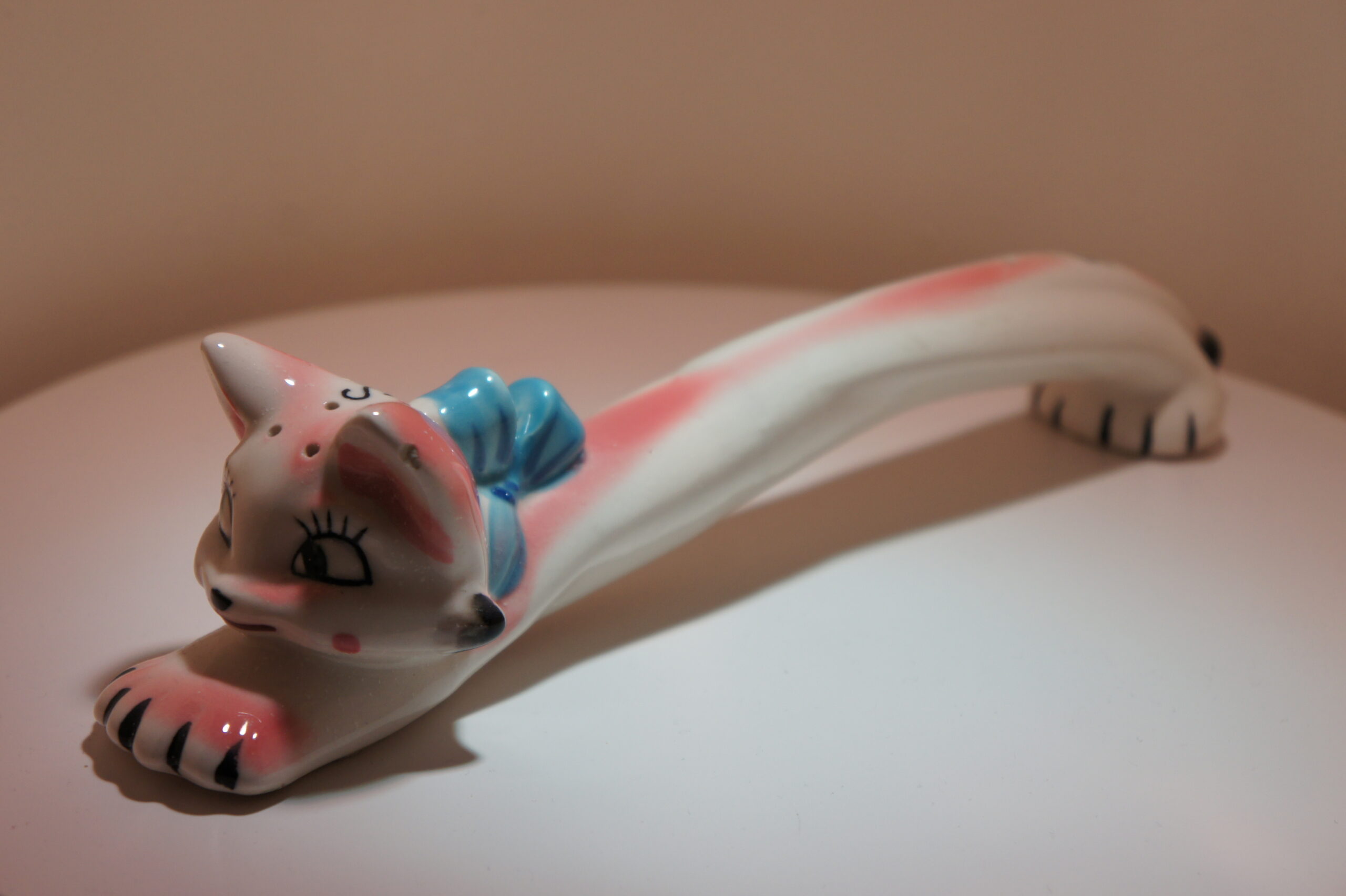 Vormgegeven als liggende kat met strik