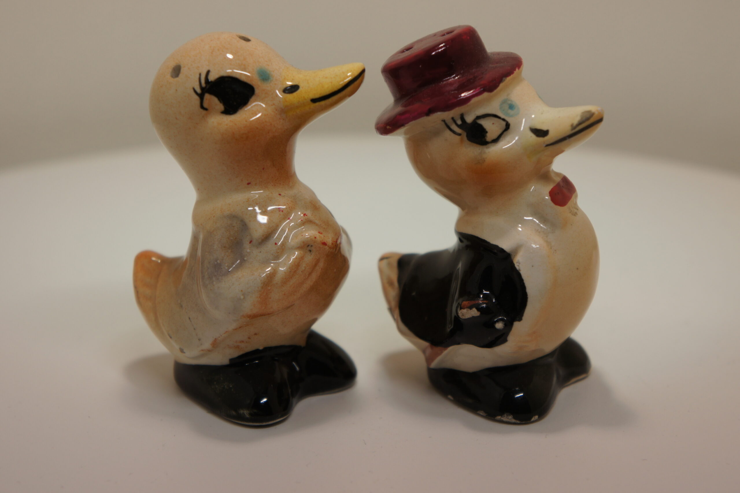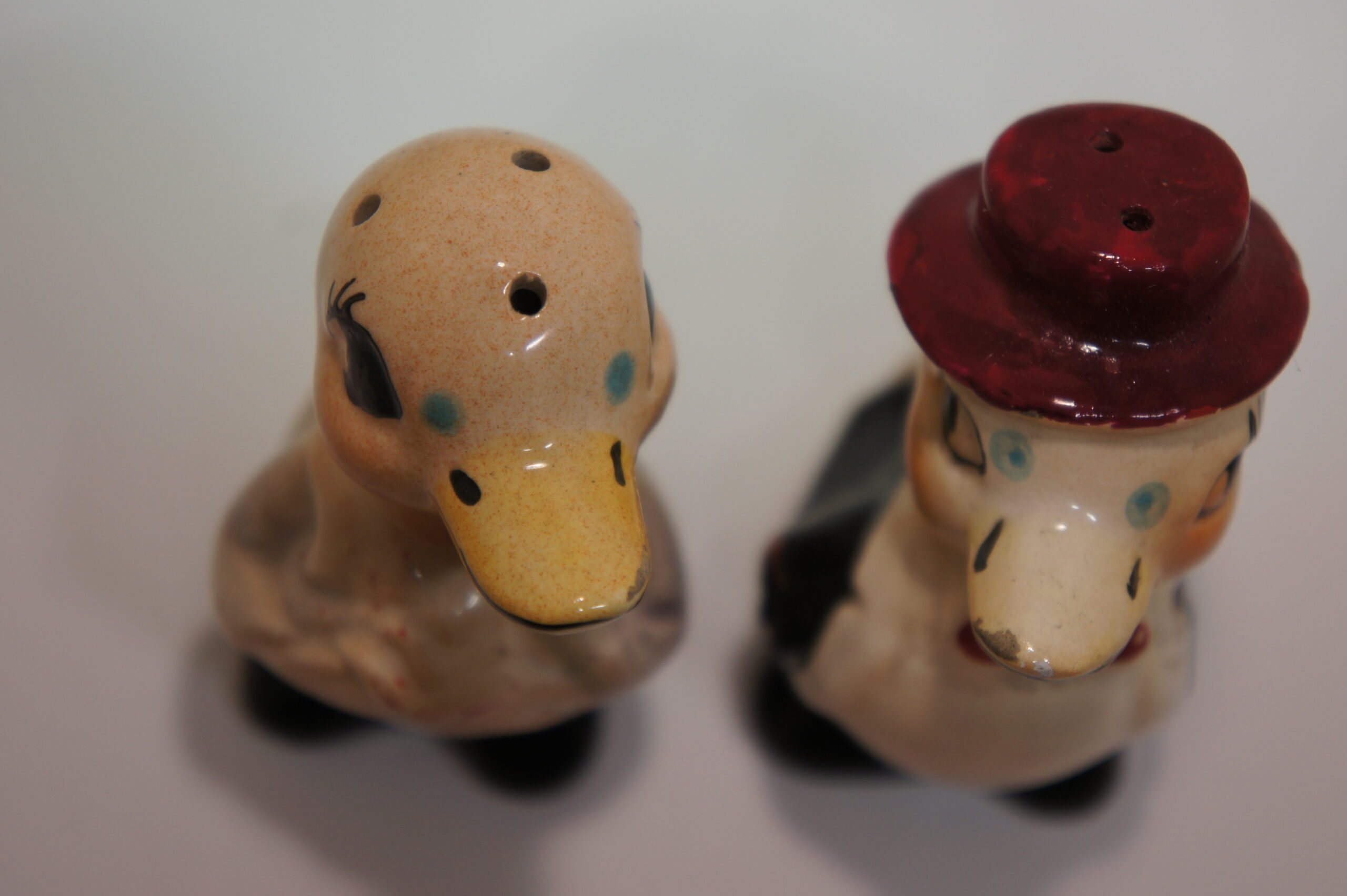 De glanzende afwerking zorgt voor een warme uitstraling. Bovendien vallen de handgeschilderde ogen, snavels en kleine kleuraccenten direct op. Hierdoor oogt dit vintage peper en zoutstel eendjes levendig en sfeervol. De eenvoudige ambachtelijke afwerking laat zien dat het waarschijnlijk om productie uit het midden van de vorige eeuw gaat. Verder passen de kleuren goed binnen de typische retrostijl die veel verzamelaars aanspreekt.