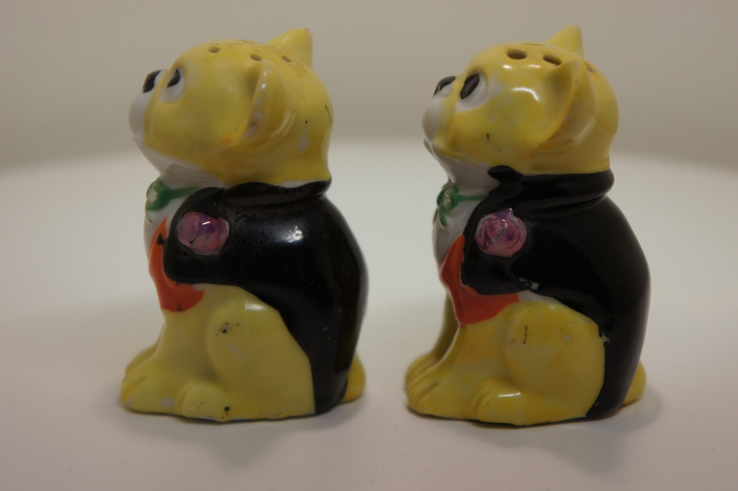 Dit vintage peper en zoutstel hondjes bestaat uit twee schattige keramieken hondjes in een opvallend gele kleur. Ze dragen ieder een rood hesje, een zwart jasje en een groene strik. Hierdoor krijgen ze een speels en charmant uiterlijk. De ronde ogen en het eenvoudige handschilderwerk geven deze figuurtjes een vrolijke uitstraling. Daarnaast maakt de retro-stijl het geheel bijzonder aantrekkelijk voor wie graag kleurrijke sets verzamelt.