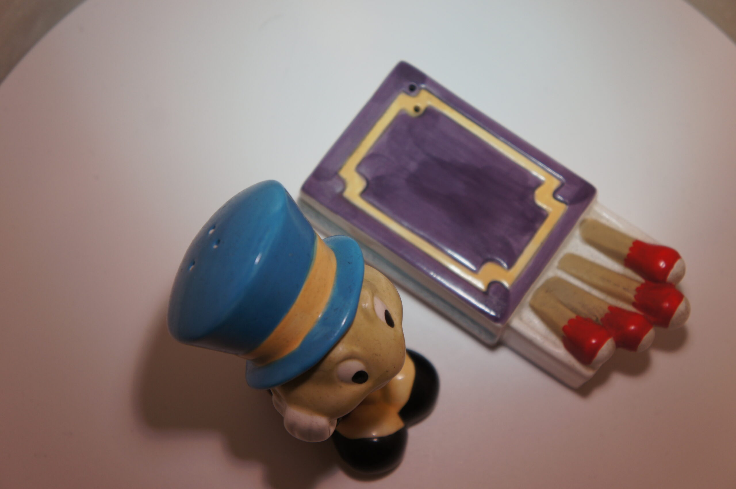 Dit bijzondere vintage peper- en zoutstel van Japie Krekel toont de bekende cartoonfiguur zittend op een decoratief lucifersdoosje. Een speels en herkenbaar ontwerp dat vooral geliefd is bij verzamelaars van Disney-gerelateerde en figuurlijke peper- en zoutstellen.