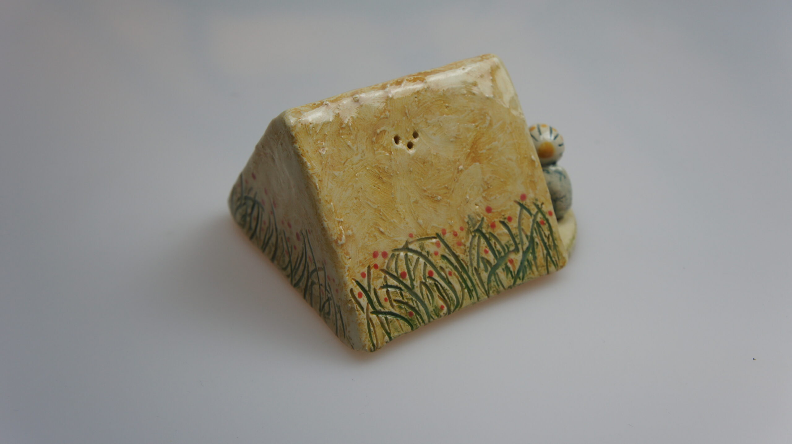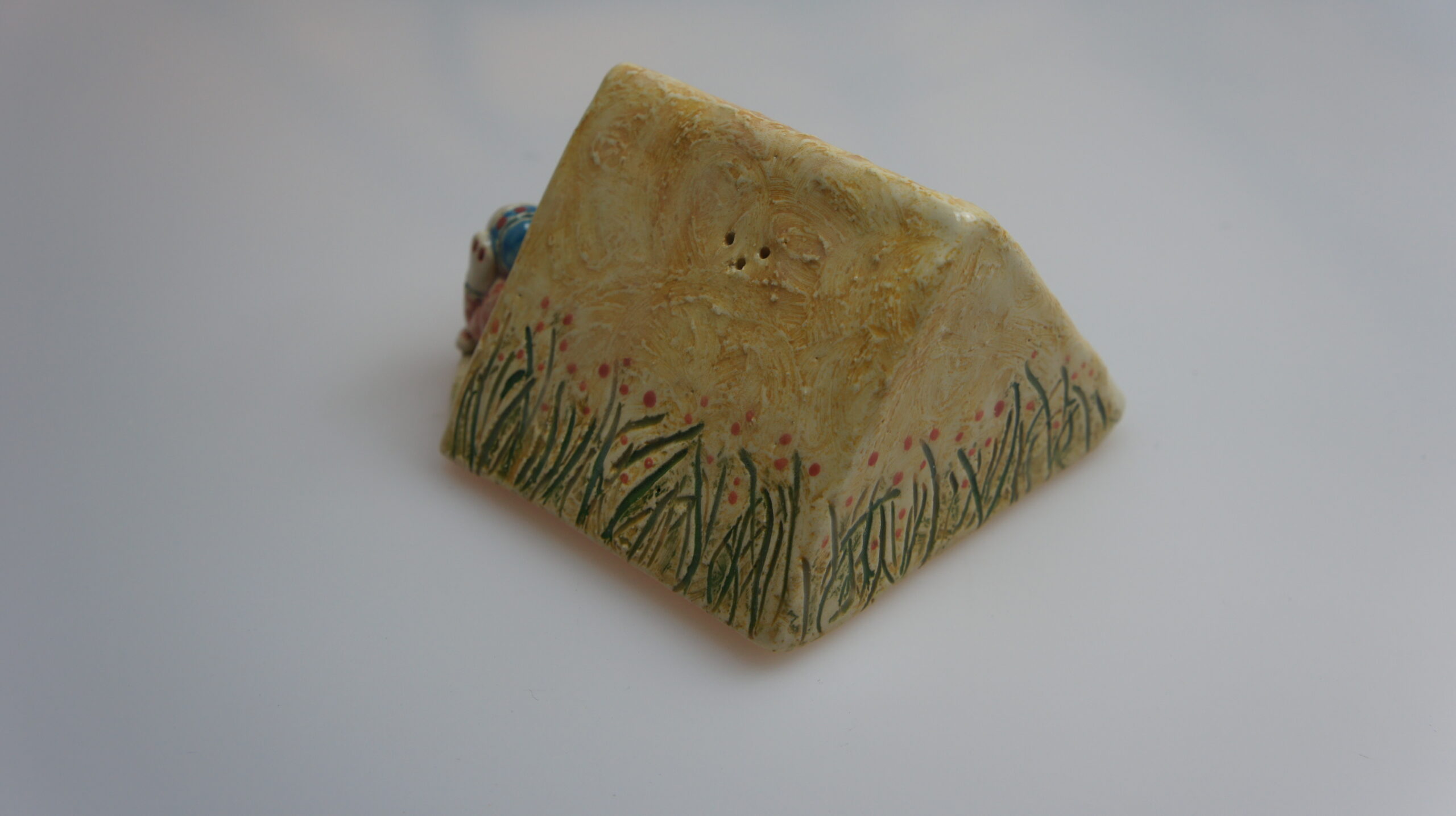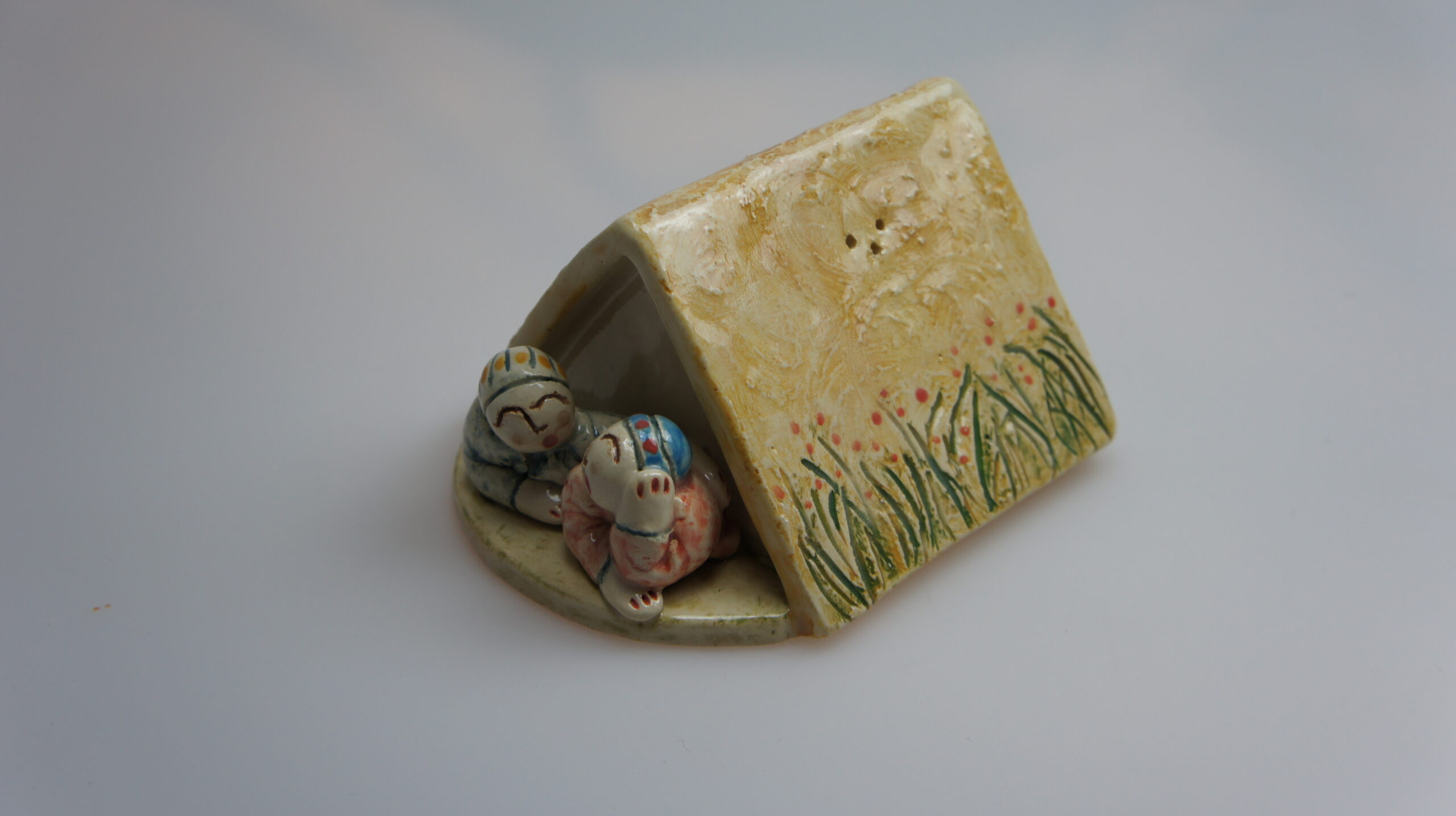 Het peper- en zoutstel “Samen Kamperen” is een kunstwerk dat een glimlach op je gezicht tovert. Deze bijzondere creatie van kunstenaar Ank Uitenbroek uit Deventer verbeeldt een intiem moment van samen kamperen. Het stelt een tent voor, subtiel versierd met zacht getinte bloemen en gras, waar twee figuurtjes onder schuilen. De vrolijke personages, gekleed in kleurrijke patronen van blauw en roze, lijken te genieten van een ontspannen moment samen. De tederheid van de een die dromerig tegen de ander aanleunt, roept gevoelens van verbondenheid en rust op.